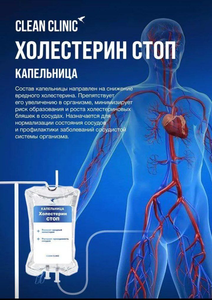 Состав капельницы направлен на снижение вредного холестерина. Препятствует его увеличению в организме, минимизирует риск образования и роста холестериновых бляшек в сосудах. Назначается для нормализации состояния сосудов.