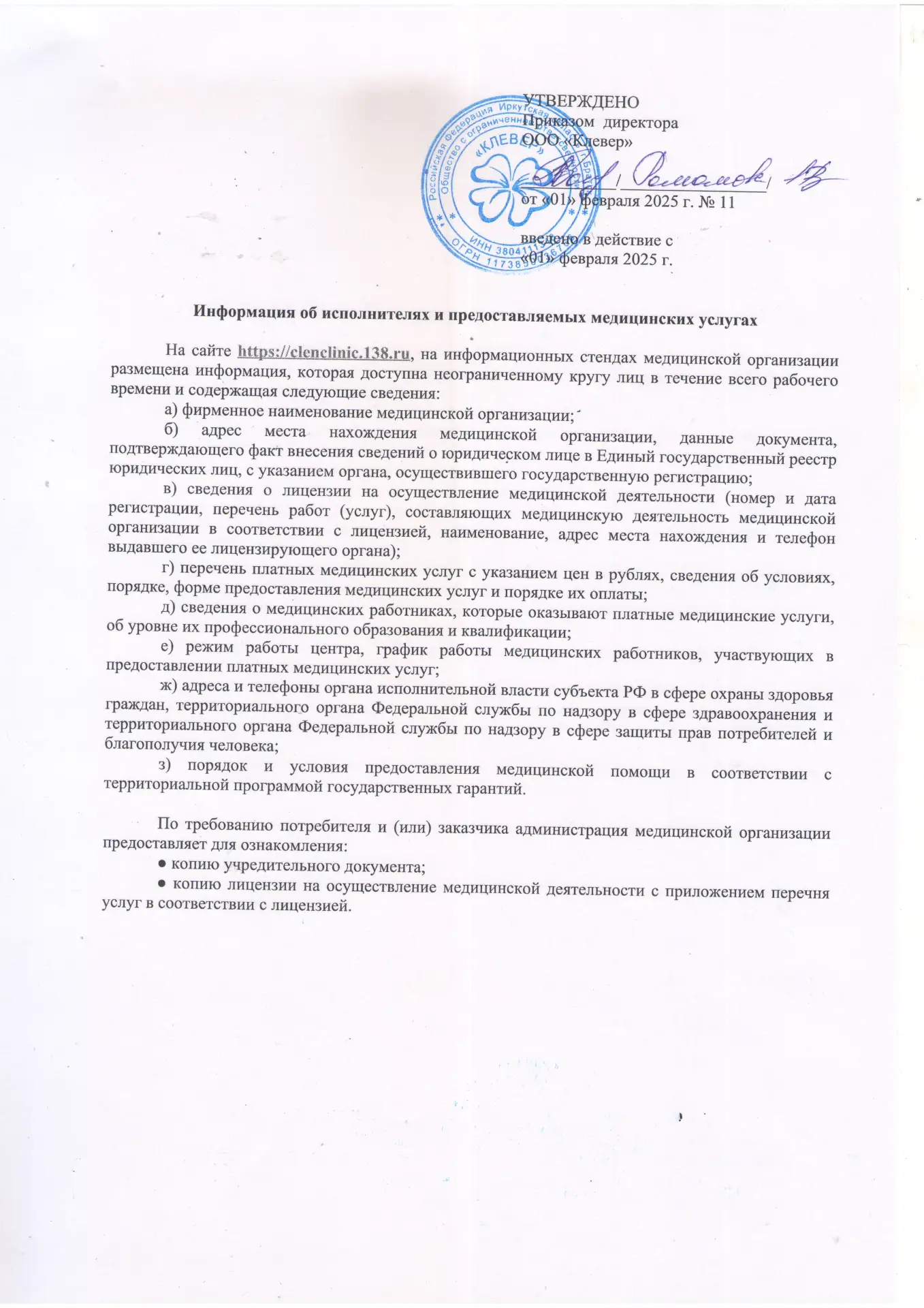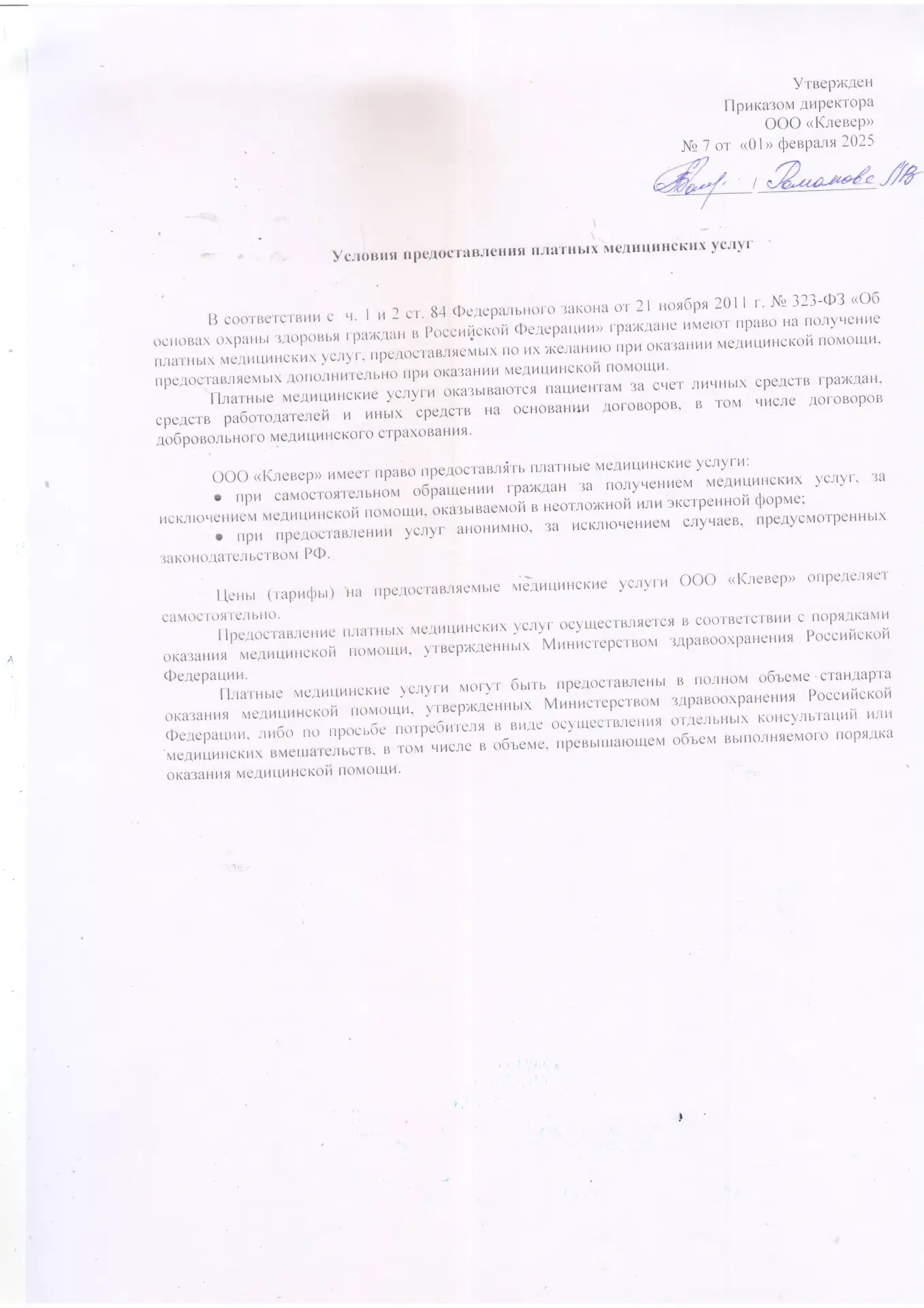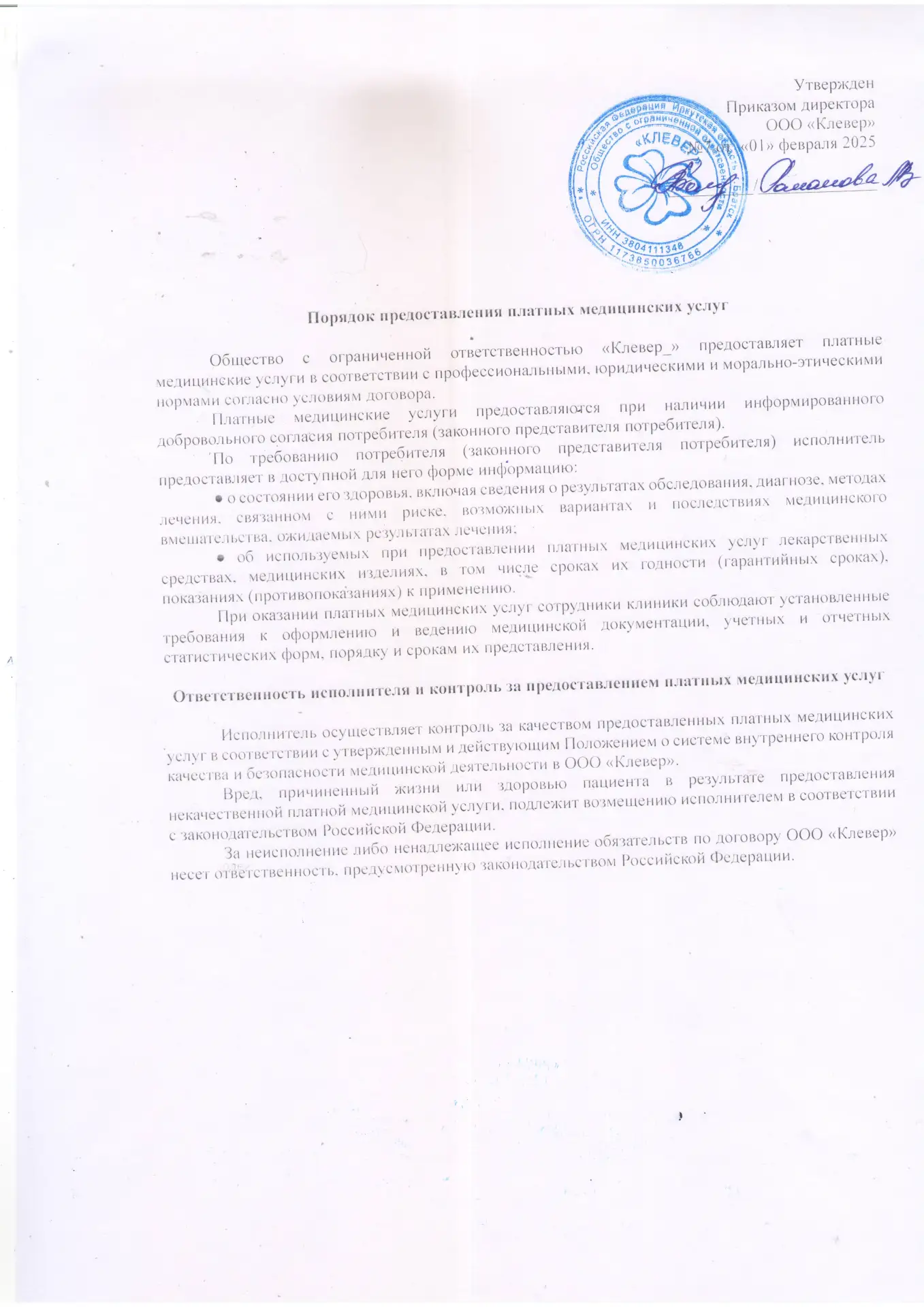 Правила оказания платных медицинских услуг в ООО «КЛЕВЕР»