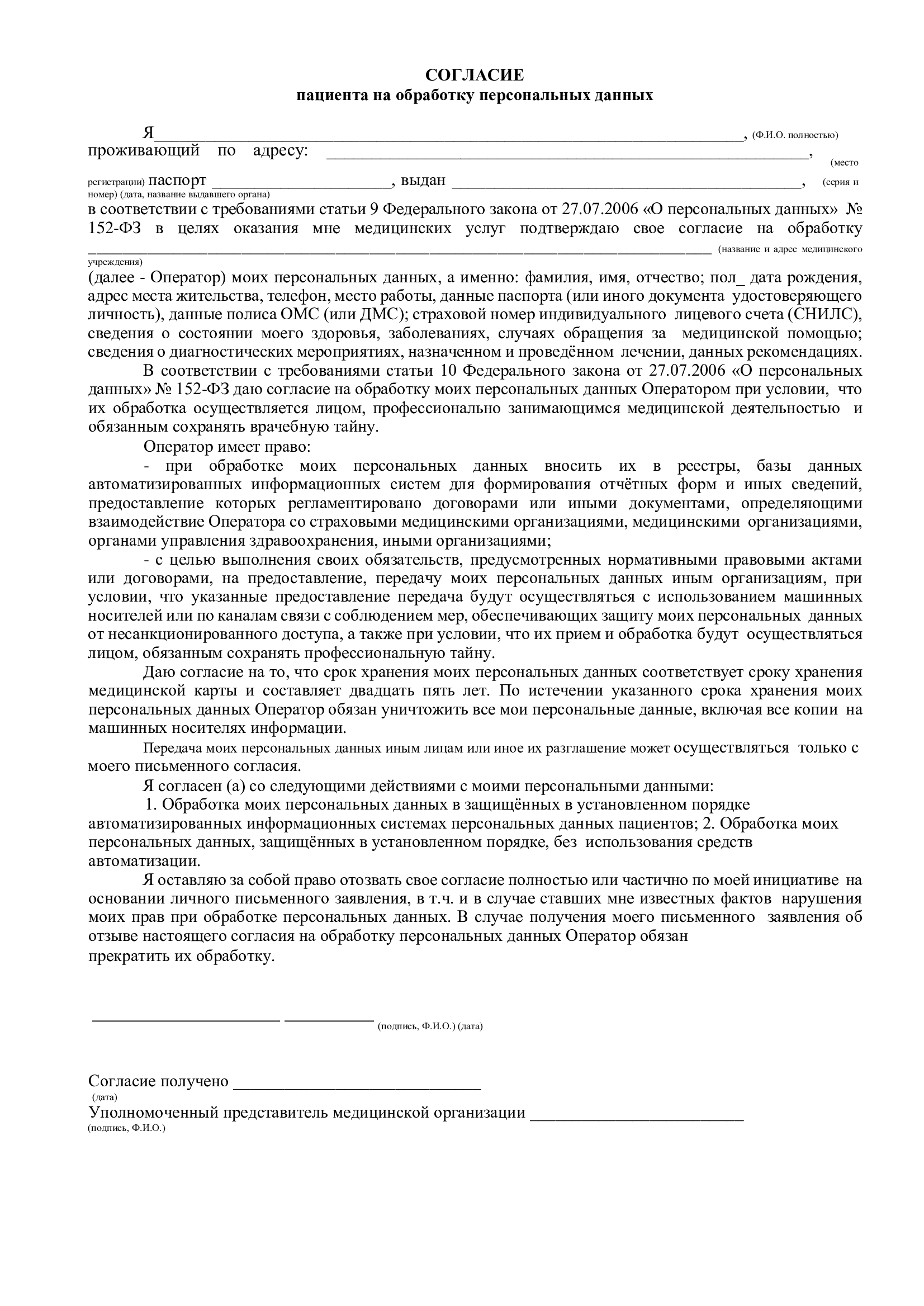 Согласие пациента на обработку персональных данных