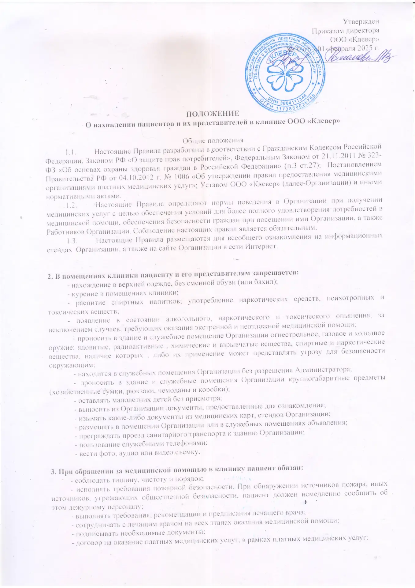 положение о нахождении пациентов и их представителей в клинике ооо «КЛЕВЕР»